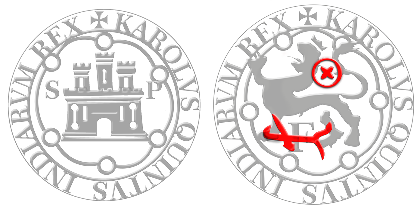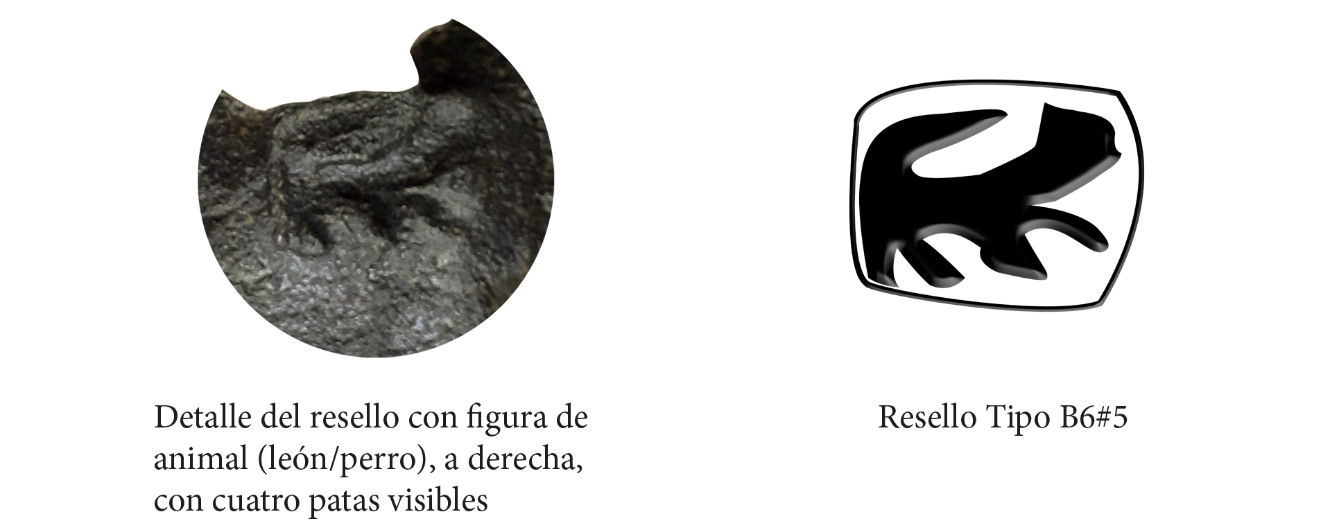 Aplicado sobre pieza de dos reales y de medio real, contamos con las instantáneas de al menos dos ejemplares, que muestran la imagen del felino con cuatro patas, algo que rompe con el resto de la iconografía asociada a este hierro.
