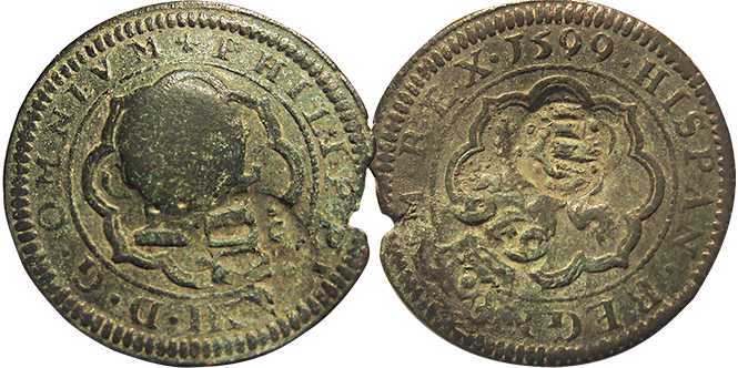 4 MARAVEDÍS FELIPE III. SEGOVIA. 1599. Resellados en dos ocasiones, con valores de VIII Y XII maravedís